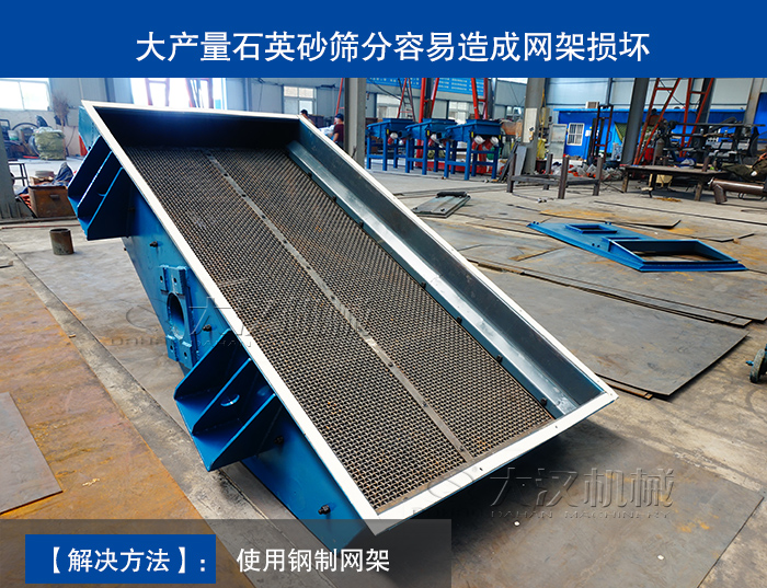 使用石英砂礦用振動(dòng)篩來(lái)進(jìn)行篩分時(shí),篩分的石英砂都會(huì)有一定的的重量,使用普通網(wǎng)架容易造成破損的問(wèn)題,所以需要使用鋼質(zhì)網(wǎng)架來(lái)代替木質(zhì)網(wǎng)架,增加網(wǎng)架和篩網(wǎng)的承受能力,更換為鋼制網(wǎng)架的石英砂礦用振動(dòng)篩不僅換網(wǎng)比較方便,更可以延長(zhǎng)篩網(wǎng)、篩機(jī)的使用壽命,鋼質(zhì)網(wǎng)架使用壽命比木質(zhì)網(wǎng)架長(zhǎng)。