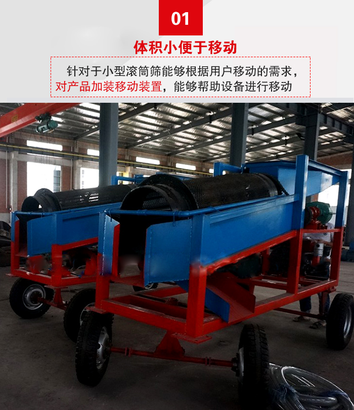 針對于小型滾筒篩能夠根據用戶移動的需求,對產品加裝移動裝置,能夠幫助設備進行移動,從而滿足用戶的需求。