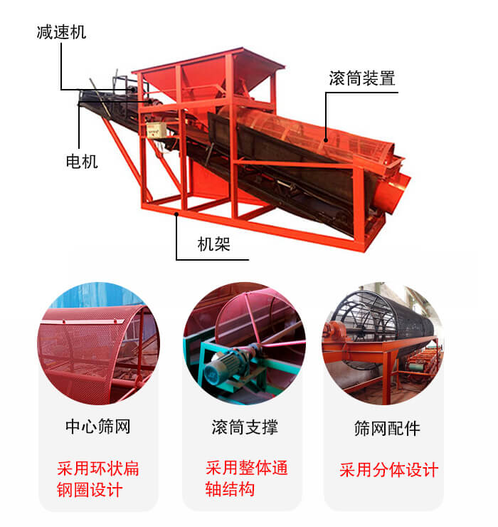 滾筒篩土機主要由:電機,減速機,滾筒裝置,機架,密封蓋等組成,