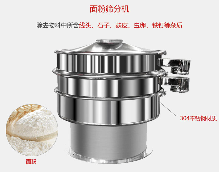產(chǎn)品簡(jiǎn)介:面粉:面粉是面包,蛋糕以及饅頭的主要原材料,由于存放時(shí)間及環(huán)境問題面粉可能會(huì)出現(xiàn)結(jié)塊的現(xiàn)象,所以要借助面粉振動(dòng)篩將其分離處理。一般要求使用20-30目的篩網(wǎng)對(duì)面粉進(jìn)行篩分。 面粉篩分機(jī)概述 面粉篩分機(jī)采用篩框,篩網(wǎng),出料口等與物料接觸的部分均采用304不銹鋼材質(zhì),常用12目、20目、24目、30目、40目、60目。使用分機(jī)主要除去物料中所含線頭、石子、麩皮、蟲卵